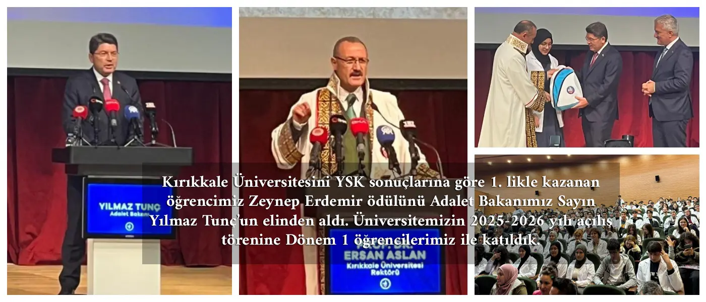 Kırıkkale Üniversitesini YSK sonuçlarına göre 1. likle kazanan öğrencimiz Zeynep Erdemir ödülünü Adalet Bakanımız Sayın Yılmaz Tunç’un elinden aldı. Üniversitemizin 2025-2026 yılı açılış törenine Dönem 1 öğrencilerimiz ile katıldık.